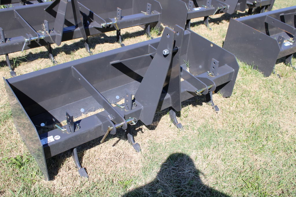 These scrapers are designed to work with 15 to 45 hp tractors, and are available in five different widths from 48” to 96”. They feature three to six adjustable ripper shanks (dependent on the width of the unit). The box blade has a 17” moldboard height, 22” depth, 6” cutting edge, and is Category I quick hitch compatible.